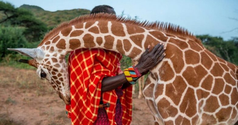 Жирафик еще совсем малыш, а все малыши любят ласку