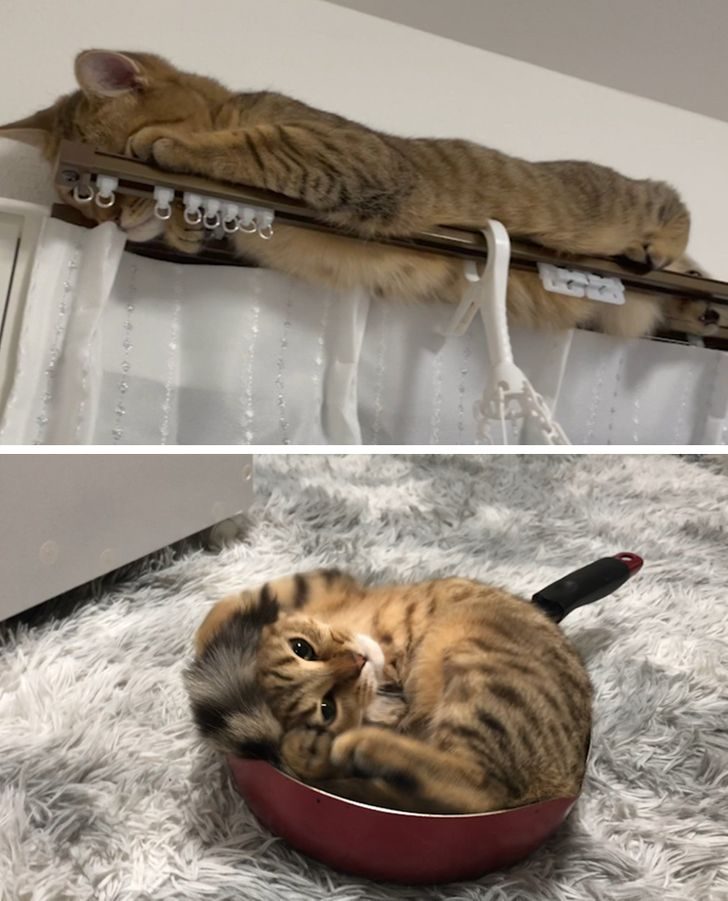 На старой квартире кот приватизировал полку для шляп на деревянной вешалке в прихожей. Он там стал спать и пришлось перестать класть туда шапки(на чём удобно — на том ляжет, а остальное скинет на пол). Оставили ему старую бабушкину шаль, он всегда стал спать там, даже планки у вешалки слегка продавил. Давно уж нет того кота, вешалка висит в саду в бане, а планки так и погнуты чуть-чуть…