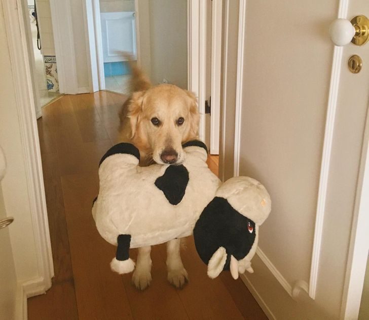 «Любимая игрушка моего пса — корова размером в половину него. И он таскает ее с собой повсюду»