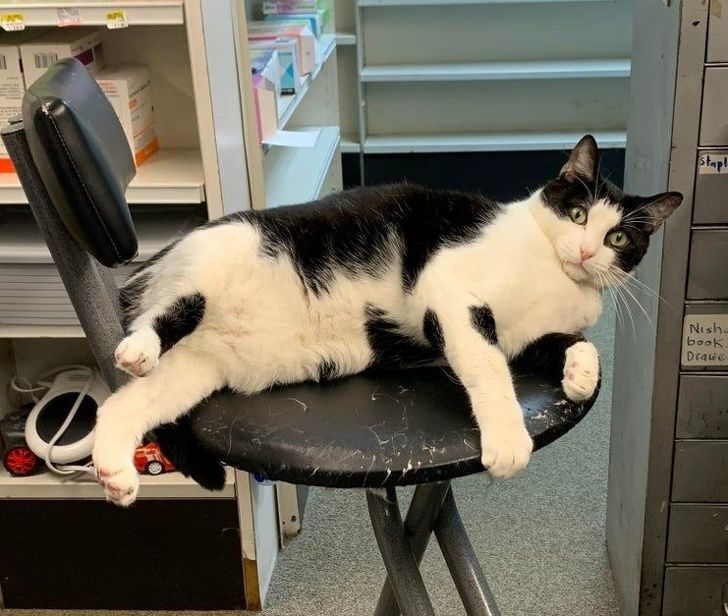 «Это кот из аптеки, в которой я работаю. Вместо того чтобы помогать, он дерет наши стулья и спит весь день. Но почему-то ему платят больше всех»
