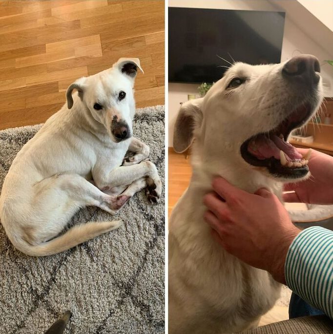 «Моя приемная собака никогда раньше не была в помещении. Это её первый сон, на кровати, в доме»