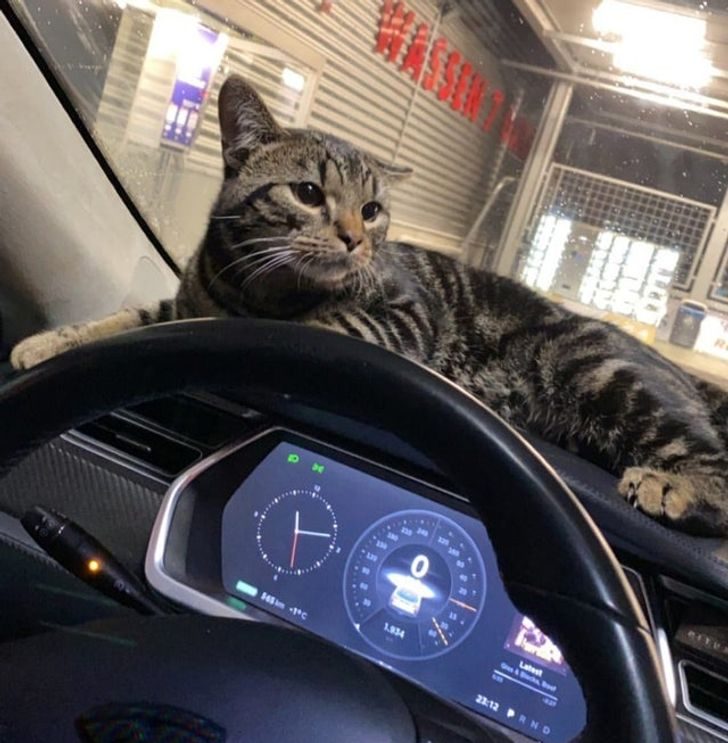 Кот привык, что хозяин везде берет его с собой. Другой жизни ему и не надо.