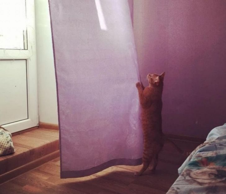 «Хорошая у меня кошка, хозяйственная. На данном фото снимает шторы, мотивируя это тем, что их давно постирать пора»