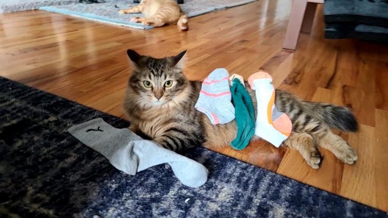 Источник: realcanadianbeaver / redditКошка постоянно ворует носки и прячет их по всему дому. На фото импровизированная студия программы “Жди меня”, где носки ищут свою пару.