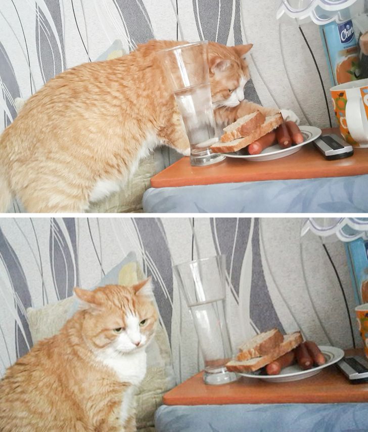 Кот обиделся, что его поймали на воровстве