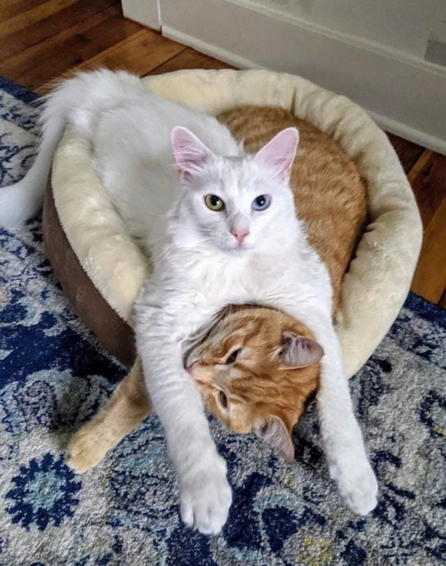 У кота полно мест для сна, но унизить собаку на её же лежанке – бесценно!