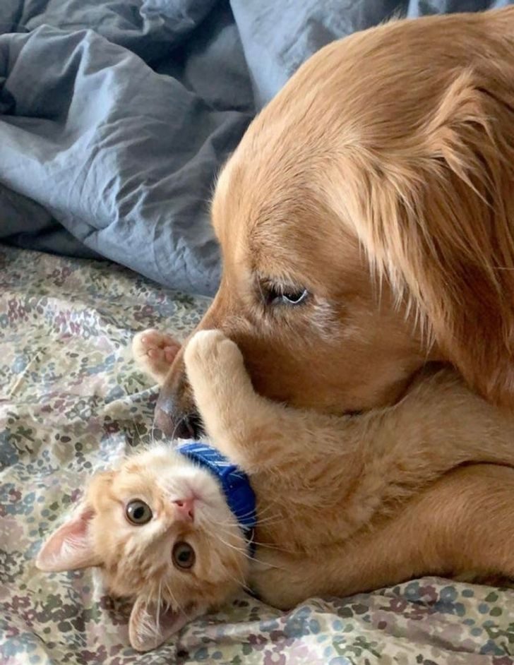 Собака сразу поняла, что нового котенка надо взять под свой контроль, чтобы не шкодил