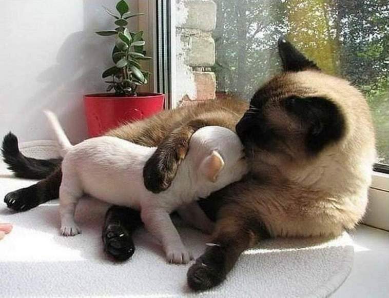 Щенку еще не хватает отваги, но кошка его всему научит!
