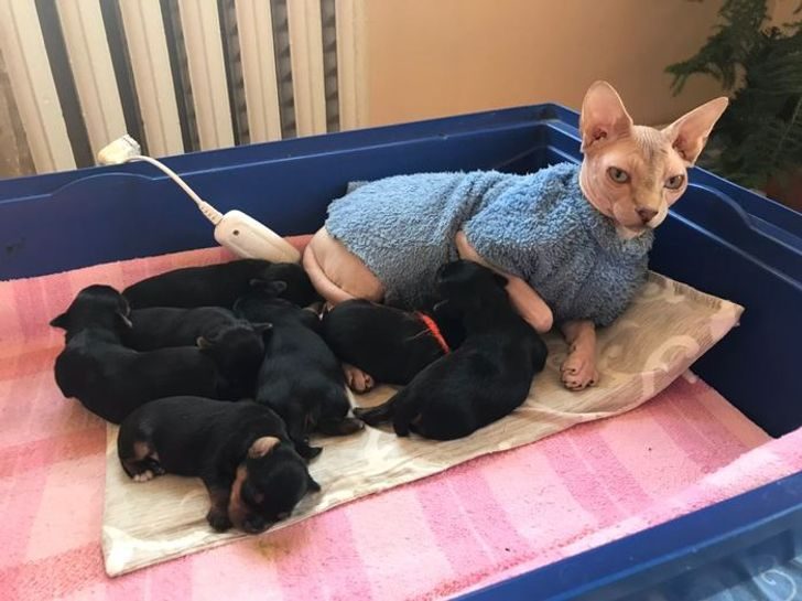 «У нас родились щенки. Мама приходит только покормить и проверить, как дела. Кот Нюха взял на себя остальные заботы»