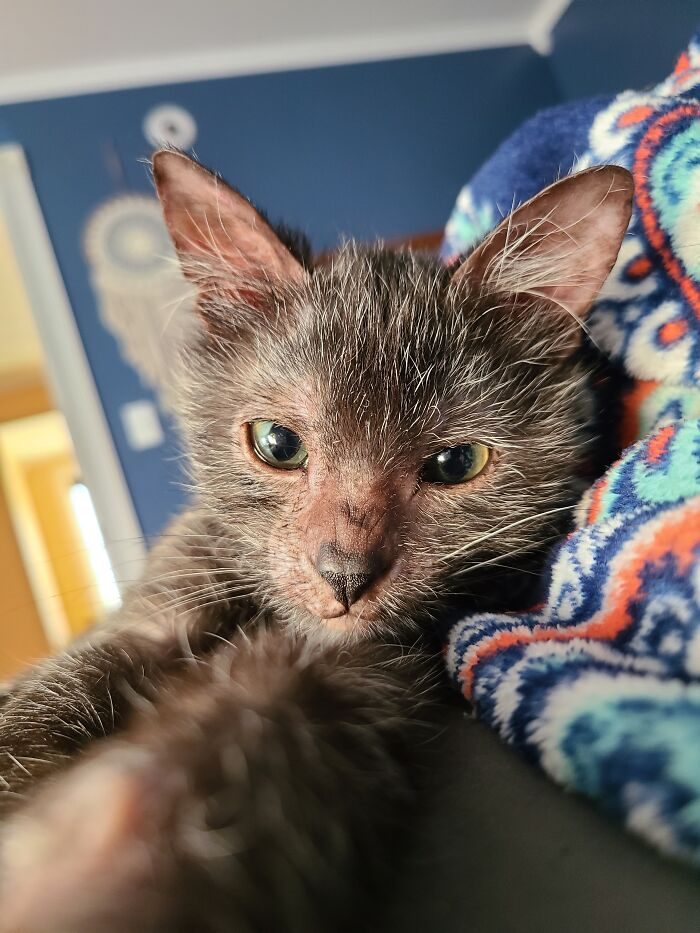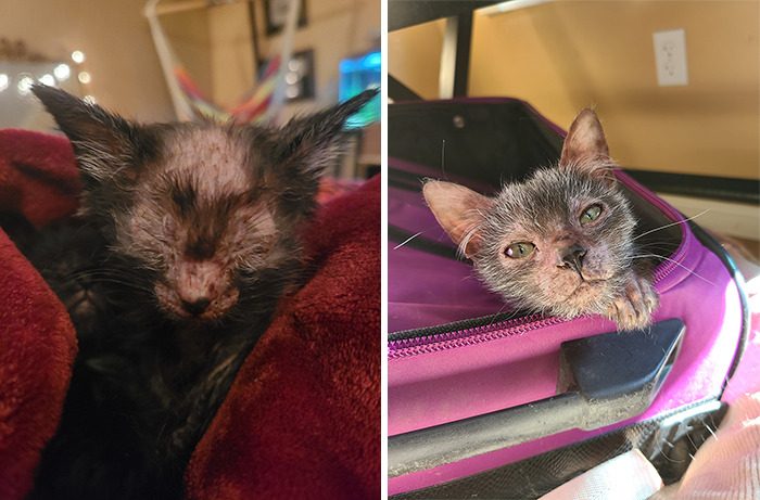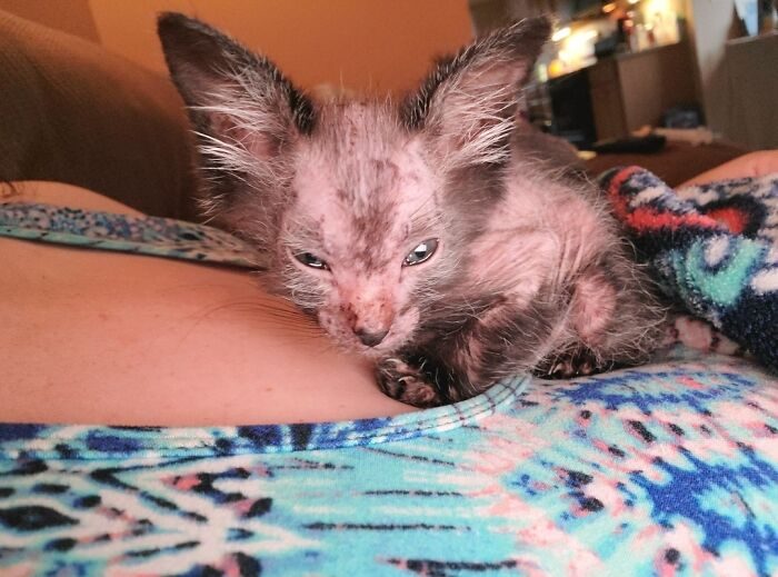 «Я заметила, что один из котят выглядел слабее остальных и терял шерсть. Я немедленно отвела его к ветеринару, который сказал, что это могло быть из-за сильного стресса, но в остальном котёнок был полностью здоров.»