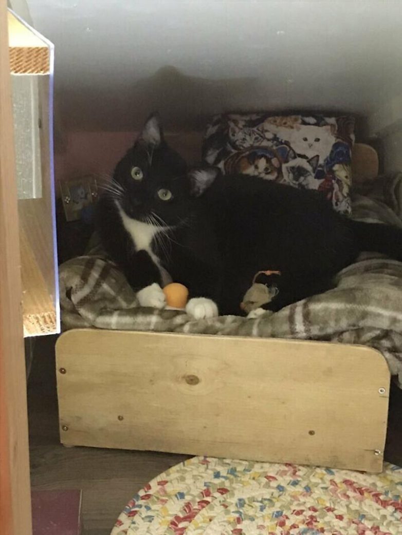 Он обставил комнату кроватью, которая по размерам чётко подходит животному, и другой крошечной мебелью, а также ковриком, когтеточкой и множеством игрушек