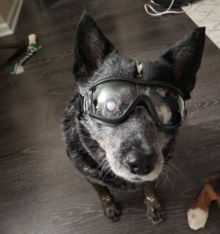 «Моя 11-летняя собака слепая, но все еще обожает походы, поэтому я купил ей защитные очки»