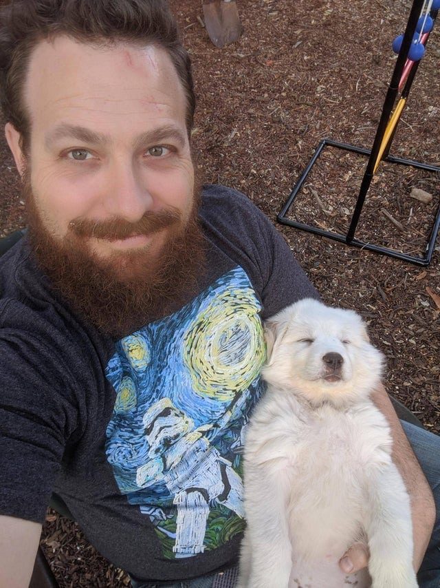 Когда рядом большой и сильный хозяин, любая собака чувствует себя щеночком