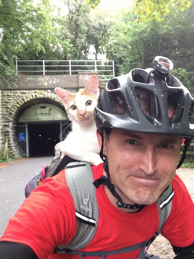 У него нет своего велосипедика, поэтому приходится ездить с хозяином, сидя в его рюкзаке