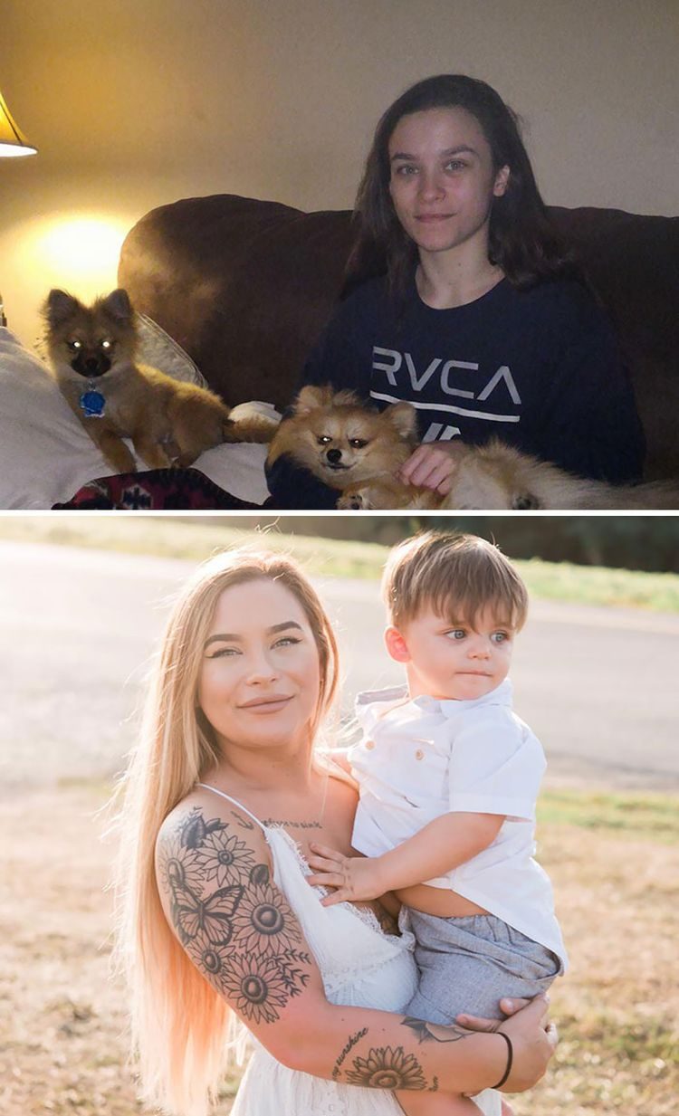 «Сегодня я уже четыре года свободна от героиновой зависимости! Верхнее фото было сделано во время активной зависимости, нижнее фото — я сейчас с моим 2-летним сыном»