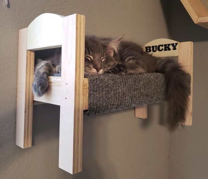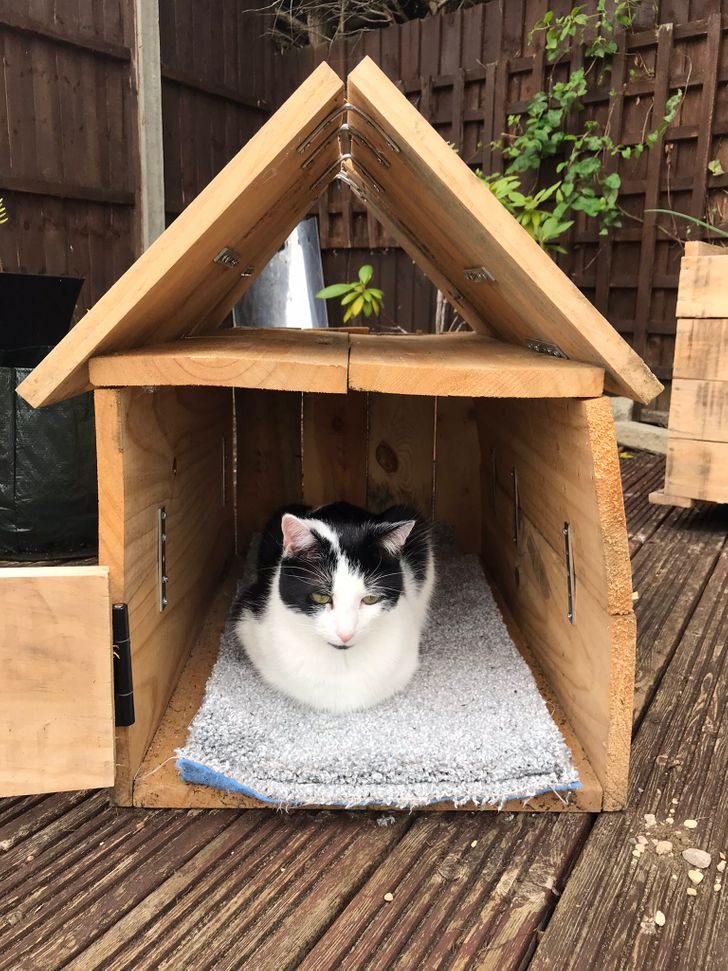 Хозяева своими руками соорудили целый кошачий домик. Судя по фото, котэ очень удивился такому подарку.