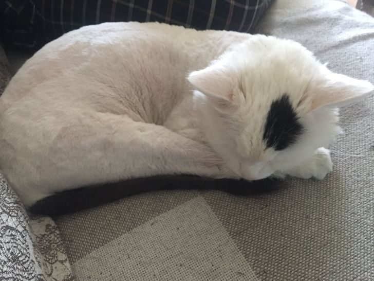 «Постригли кота ближе к маю, так как колтунов было много. Думали, в мае ему не будет холодно. Спасибо погоде — кот замерз. Укутала беднягу в куртку. Спит»