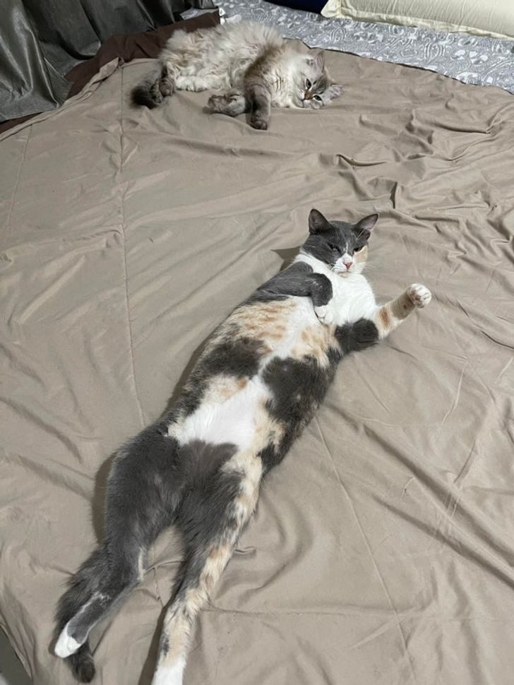 «Как-то раз я не пришел домой ночевать. И вот результат… Я смотрел на это в шоке, а он пришел и завалился сверху. К слову, против шлейки кот не возражает»