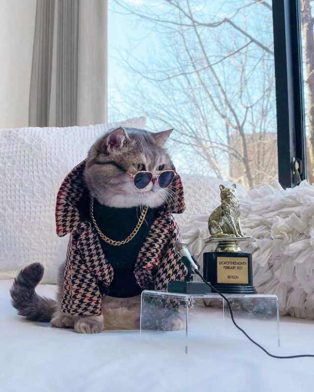 С тех пор, как Бенсон приехал в свой новый дом, у него появилась страничка в Instagram. У пушистого котика есть целый гардероб, заполненный эксклюзивными предметами одежды и аксессуарами, и на момент публикации этого поста — 173 тысячи подписчиков в Instagram.