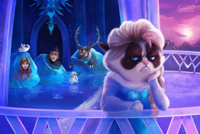 Какое отношение положительный Дисней имеет к сварливой Grumpy Cat? Вроде бы практически никакого, но оказалось, что они идеально подходят друг к другу, как соль и перец, как инь и ян. Сварливая кошка была настолько сильной персоной, что смогла бы мгновенно изменить ход обычно очень позитивных фильмов Диснея, и эти рисунки американского художника прекрасно это иллюстрируют.