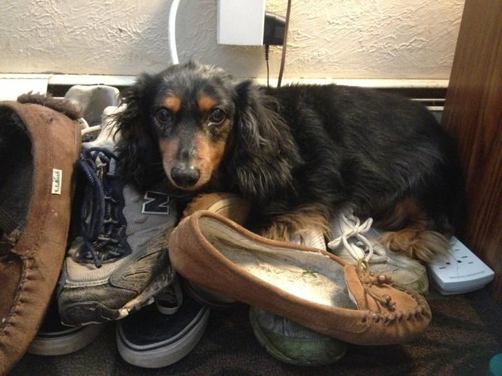 Песик-пенсионер никогда не грызет обувь, зато обожает спать на ней. И реально расстраивается, если взять пару.