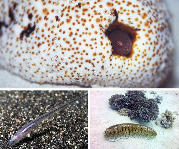 Морские огурцы (или голотурии) — медлительные беспозвоночные, обитатели морского дна. Рыбки-жемчужницы часто используют их как убежище, проникая внутрь через анус: там они могут жить целой компанией, иногда подъедая и самого хозяина. К счастью, морские огурцы обладают способностью к регенерации внутренних органов, а некоторые виды голотурий защищаются от надоедливых обитателей с помощью зубов в заднем проходе.