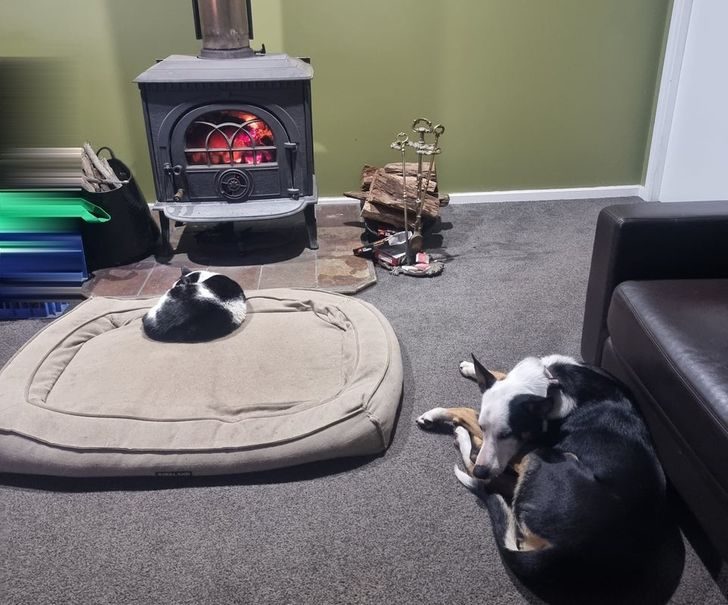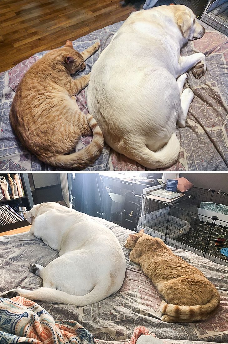«Моя кошка всегда смотрит на собаку, а затем ложится в ту же позу, что и она»