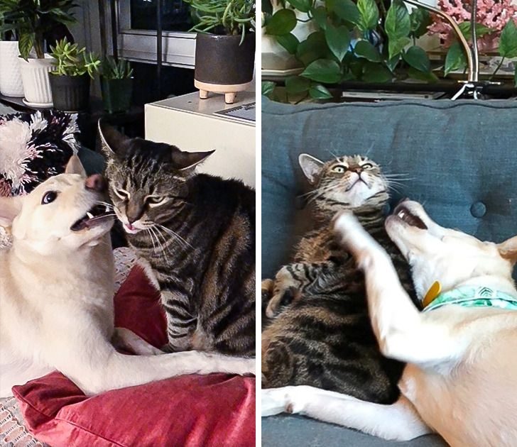 «Нашел эту кошку на улице, и она влюбилась в мою собаку. Моя собака не так счастлива, но все понимает»