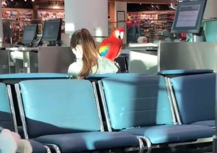 9. Женщина ждет посадки на рейс со своим попугаем