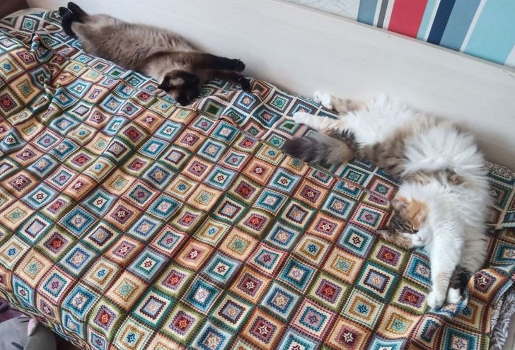 «У меня старый кот учит кошку всякому. Она не умела спать кверху животиком, не орала никогда. Теперь умеет все»