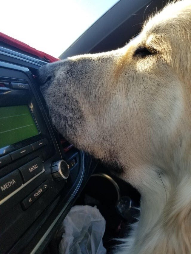 Наш пёс всегда сидит в машине как человек