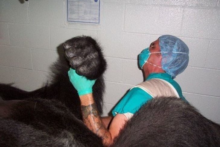 2. «Мой дядя — ветеринар в зоопарке. Он сфотографировал своего коллегу, который поднимает руку гориллы, пока та находится под действием снотворного»