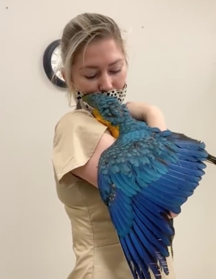 13. Ара только что проснулся от наркоза. Врач утешает эту птицу. Такая добрая женщина