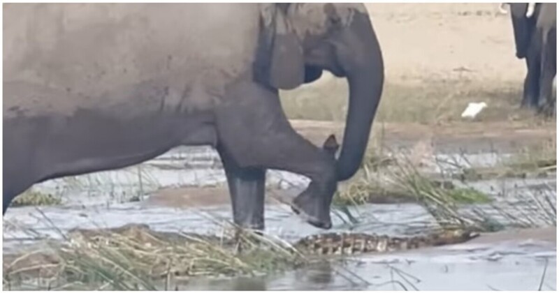 Слониха затоптала крокодила, защищая своего детеныша
