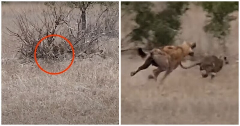 Самка леопарда отправилась на охоту и оставила своего 11-месячного детеныша в кустах. Одна из проходивших неподалеку гиен заметила кроху и решила на него напасть. Турист запечатлел, как детёныш лепарда спасается от голодной хищницы бегством.