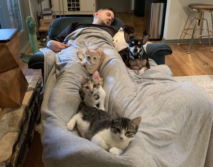 «Вчера мой парень должен был присматривать за котятами. Когда я вернулась, в доме было подозрительно тихо. Я вошла в гостиную и застала всех в таком виде»