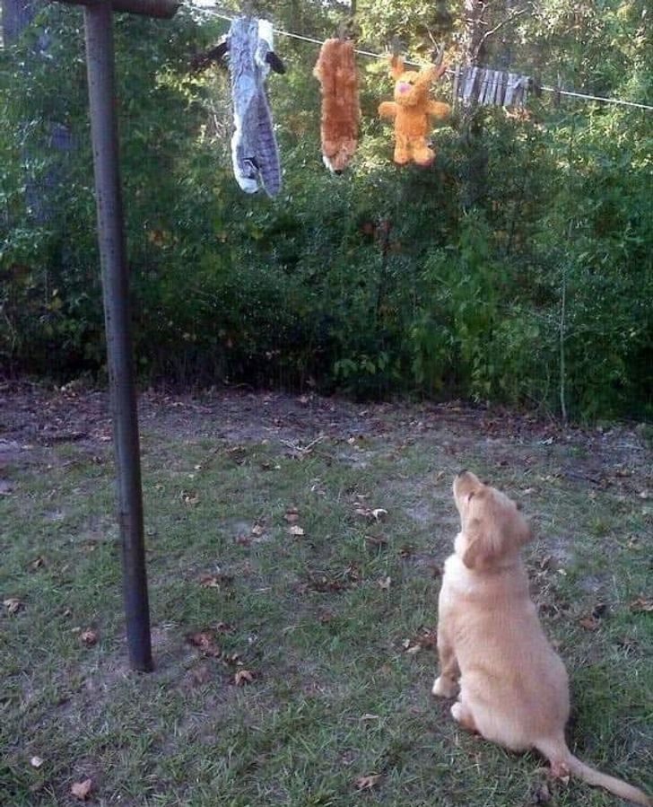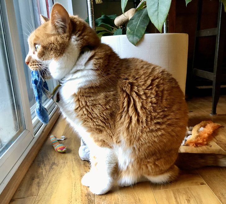 «Мой мальчик Ральф наблюдает за птицами, держа в зубах одну из своих любимых игрушек»