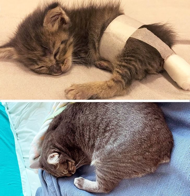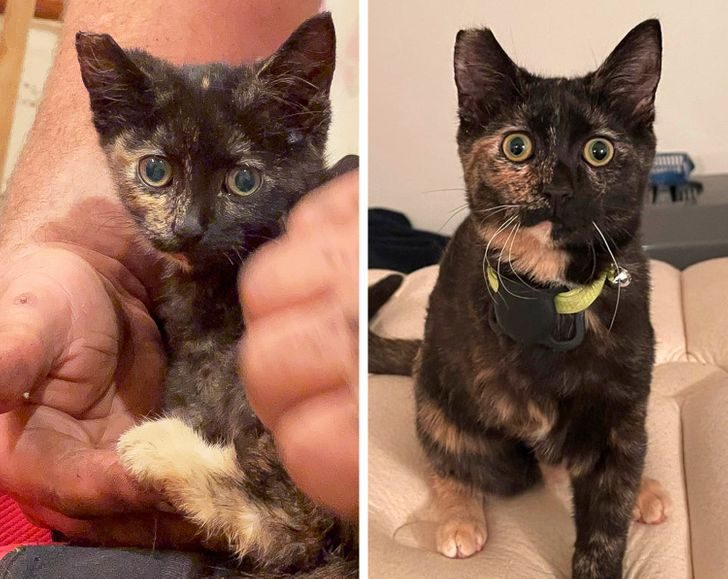 «Слева мой кот за 5 дней до того, как я его усыновила. Фото справа сделано сегодня. Он самый милый и заботливый кот, и я благодарна судьбе за него»