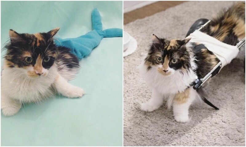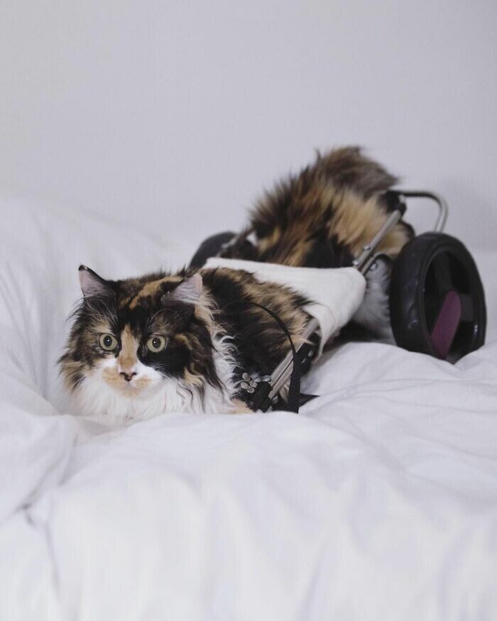 Врачи сказали, что кошечка не сможет ходить. Но ее спасительница не сдалась — она решила забрать Салли к себе и подарить лучшую жизнь. Она научила кошку использовать специальную конструкцию с колесами, чтобы она могла передвигаться, и создала аккаунт Салли в Инстаграме, где она каждый день публикует фото красавицы.