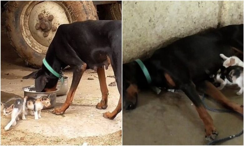 На этих трогательных кадрах — собака-доберман, которая потеряла своих щенков. Несмотря на горе, собачка нашла, кому подарить свою любовь — она начала заботиться о крохотных осиротевших котятах, как о своем потомстве. Все домашние животные принадлежат мужчине по имени Субрамани, индийскому фермеру, который живет в штате Тамилнад.
