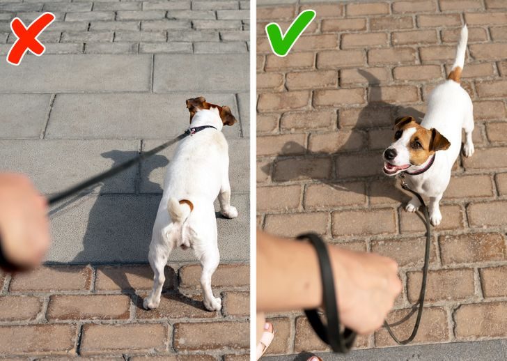 Научить щенка или отучить взрослую собаку (а это сложнее) можно, если притворяться неподвижным деревом, когда животное начнет вас тянуть. Как только поводок ослабнет и усатый попытается понять, что стряслось, можно тихонько пойти. Двигайтесь только тогда, когда поводок не натянут. Собаке придется понять, что единственный способ нормально погулять — идти рядом, а не тянуть хозяина за собой.