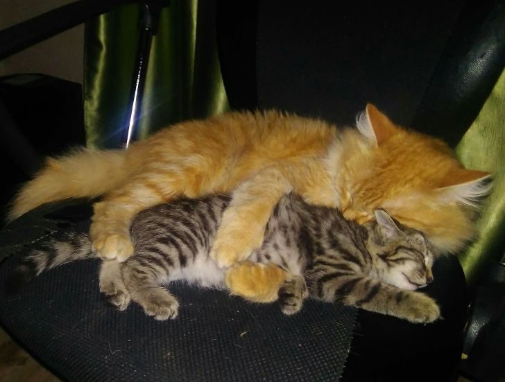 «Единственный из всех моих кошаков, кто помогал присматривать за новорожденными подкидышами, которых мы выкармливали. До сих пор играет с подросшими котятами так, будто он сам еще маленький котенок. Удивительный и очень благодарный котяра!»