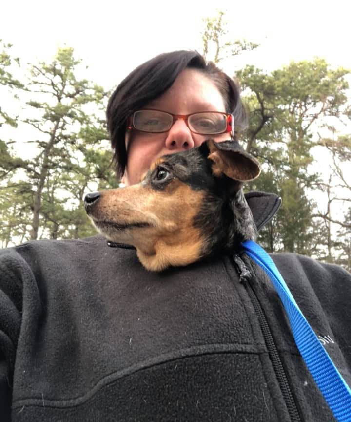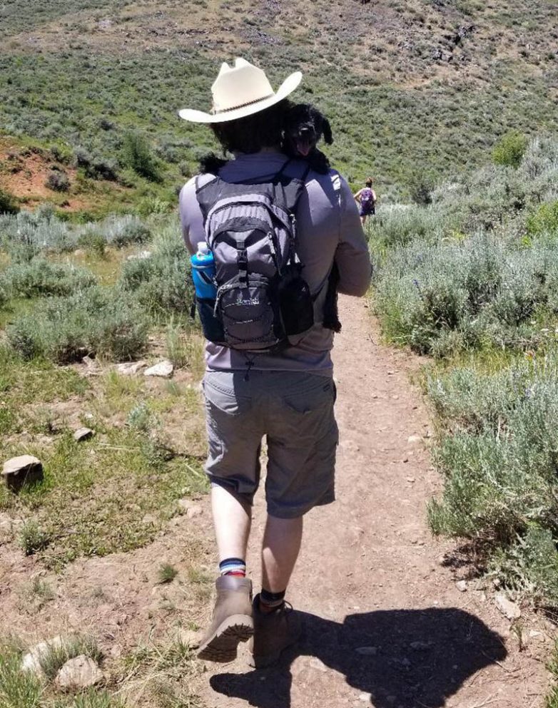 “Мой щеночек Блу еще мал, поэтому я ношу его в разгрузке”