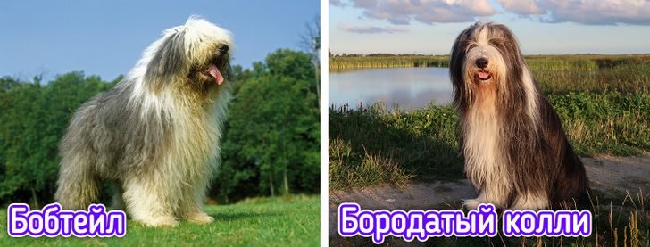 Бобтейл и бородатый колли кажутся очень похожими, потому что у них много схожих характеристик, но различить этих собак не так и сложно. Бобтейл — большая собака, для которой характерна длинная, густая, лохматая серо-белая шерсть, покрывающая морду. Бородатый колли меньшего размера, а шерсть у него не слишком длинная, лохматая, жесткая, без завитков и чаще имеет черный, коричневый, голубой или пепельный оттенки. У этой породы шерсть также покрывает морду, однако, в отличие от бобтейла, в области переносицы она встречается редко.