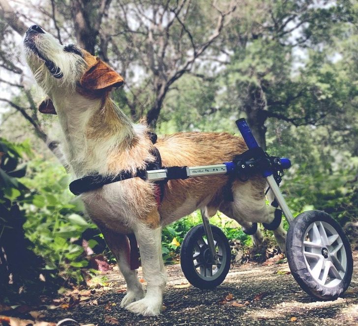 «Наш милый Тоби был найден в канаве, задние лапы у него отказали. Теперь он король дорог на 2 колесах»