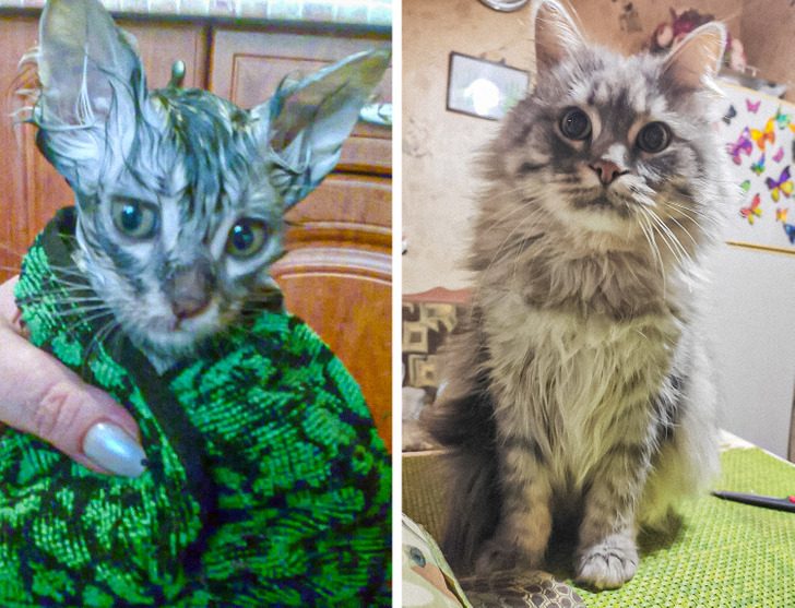 «Это Кекс, первый день дома, выводим блох. Тогда он был весом с пачку масла, одни глаза и уши. 4 года спустя это крупный умный кот с обычными ушами»