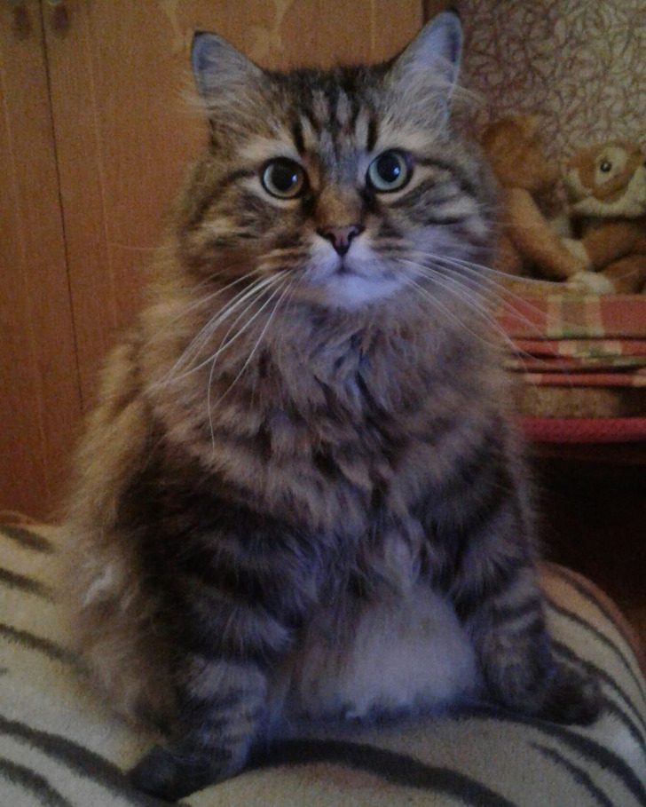 «Подобрали кота на даче в середине октября, привезли домой. Кот очень осторожно обошел квартиру, потом прыгнул ко мне на колени и заглянул в глаза»