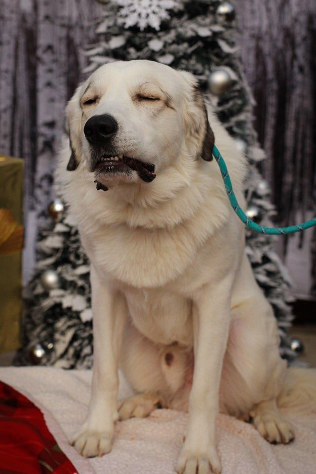 Позирует перед ёлочкой и показывает какие у него красивые, белые зубки