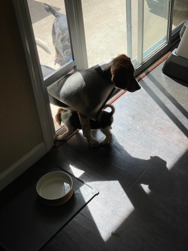 Старший брат помогает сестре пройти через дверцу для собак