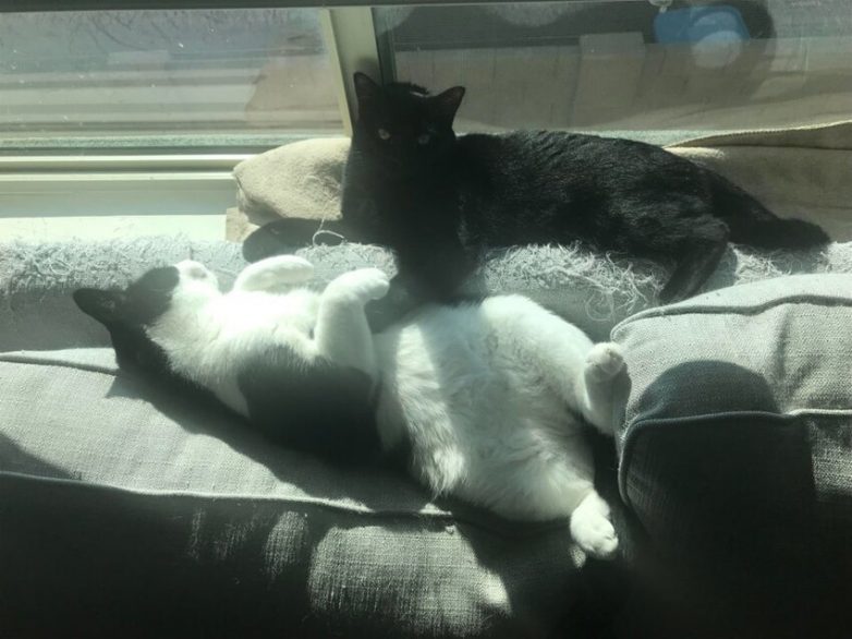 Один наш кот отходит после наркоза, и второй пока чешет ему животик